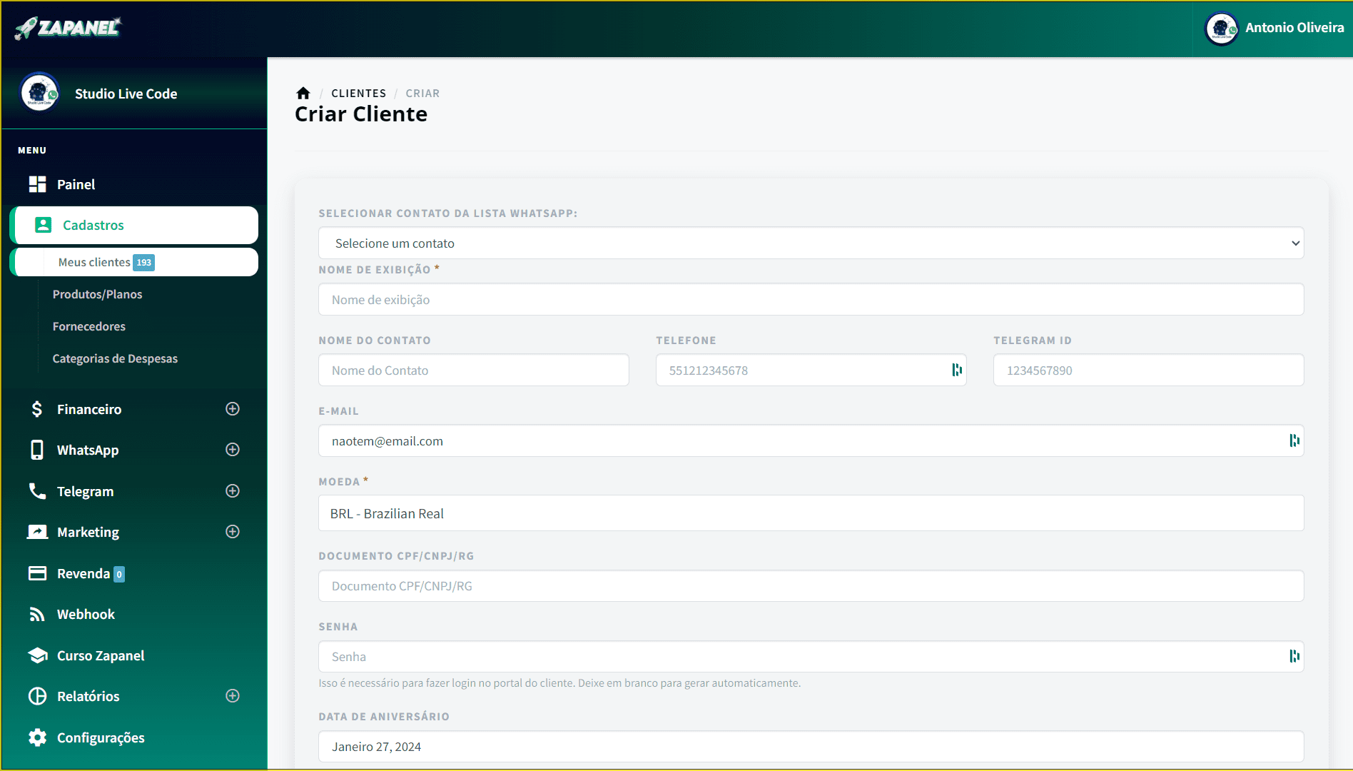 Cadastrar seus clientes em nossa plataforma para cobranças automáticas é extremamente simples. Ao criar o cadastro do cliente, você pode adicionar produtos ou planos e gerar a fatura de cobrança instantaneamente.