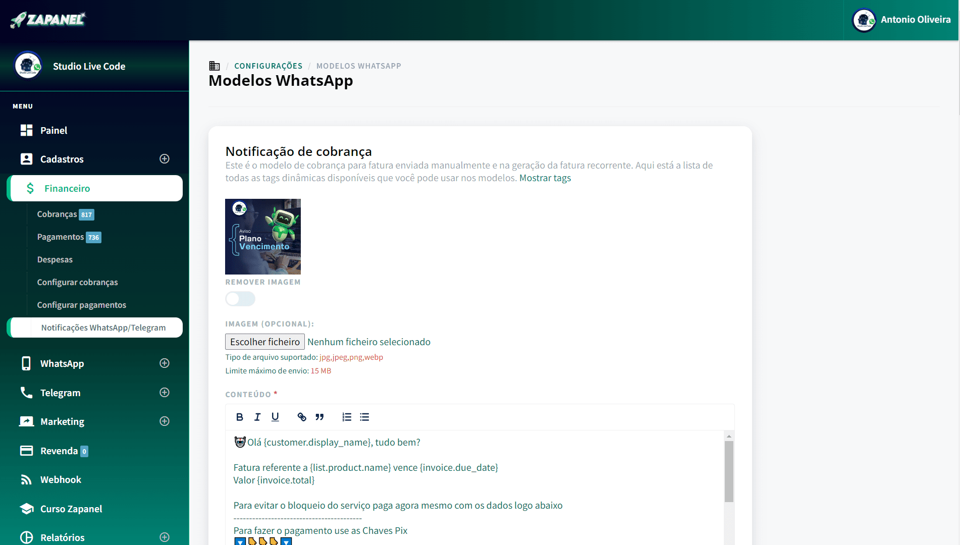 Potencialize suas cobranças com os templates de mensagens do Zapanel, uma ferramenta poderosa para personalização e eficácia. Crie mensagens personalizadas com nome do cliente, valor da cobrança e informações relevantes, agora ainda mais impactantes com a adição de imagens. Além disso, edite facilmente os templates de acordo com suas necessidades e preferências, tornando sua comunicação ainda mais eficiente e atrativa.